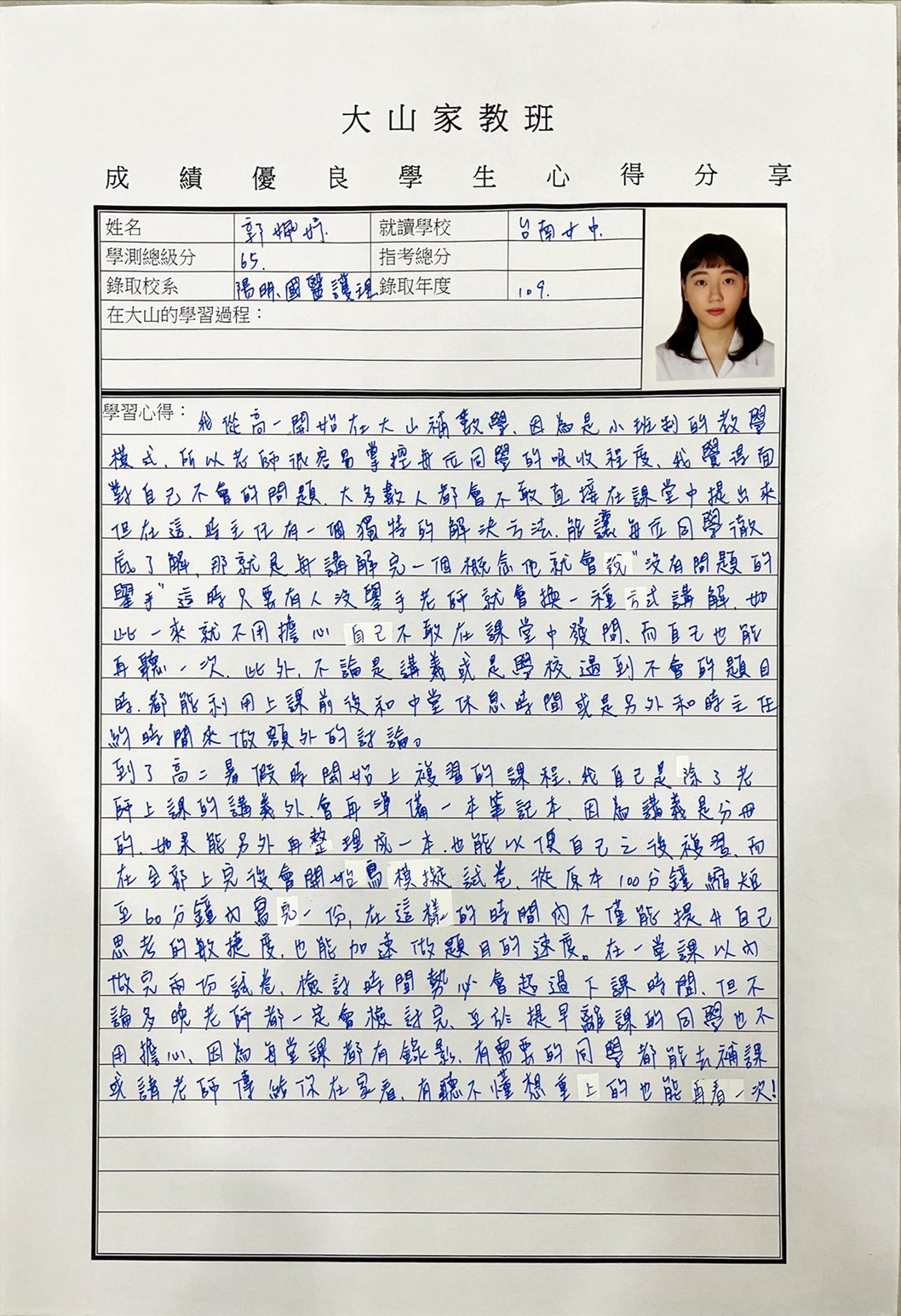 我從高一開始在大山補數學,因為是小班制的教學模式,所以老師很容易掌控每位學生的吸收程度,我覺得面對自己不會的問題,大多數人都會不敢直接在課堂中提出來,但在這,時主任有個獨特的解決方法,能讓每一位同學徹底了解,那就是每講解完一個概念他就會說”沒有問題的舉手”,這時只要有人沒舉手老師就會換一種方式講解,如此一來就不用擔心自己不敢在課堂中發問,而自己也能再聽一次。此外,不論是講義或是學校遇到不會的題目時,都能利用上課前後和中堂休息時間或是另外和時主任約時間來做額外的討論。